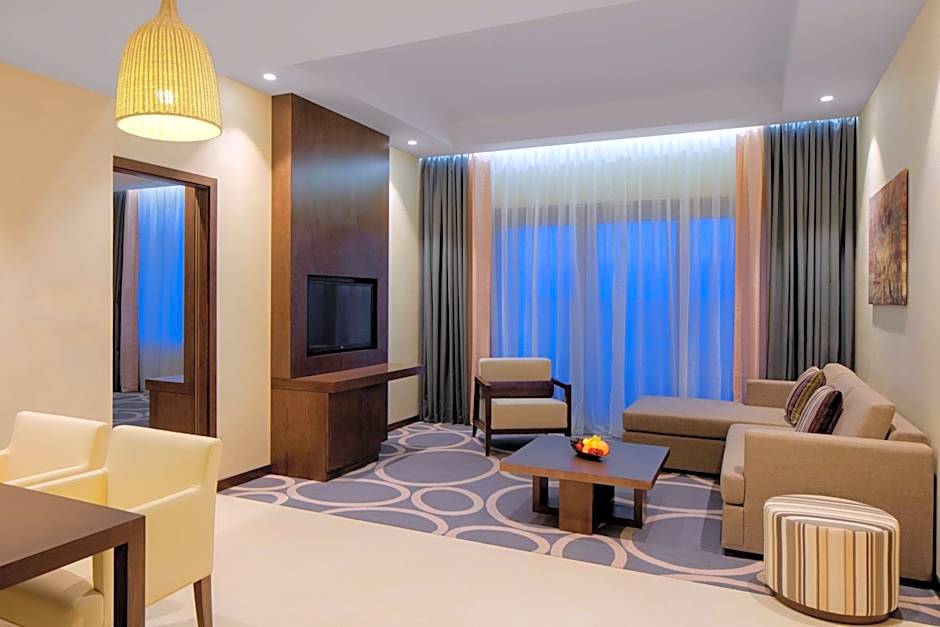 This One-Bedroom Suite features a living room and stunning views of the ocean from its balcony and includes a Nespresso® coffee machine, complimentary Wi-Fi, a secure safety deposit box, and convenient tea and coffee-making facilities. The bathroom is elegantly designed with both a shower and a bath, complemented by a plush bathrobe for added comfort.
